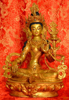 Tara Protector from the Perils of Fire On an outer level, she protects us from raging fires that can destroy entire forests, regions, and homes, whether caused by negative karma, natural circumstances, or harmful behavior. On an inner level, she dispels illnesses and negativity caused by anger. Her left hand displays the mudra of refuge-granting and holds the stem of a lotus on which rests a crystal with flowing water. Her right hand is in the mudra of generosity. |